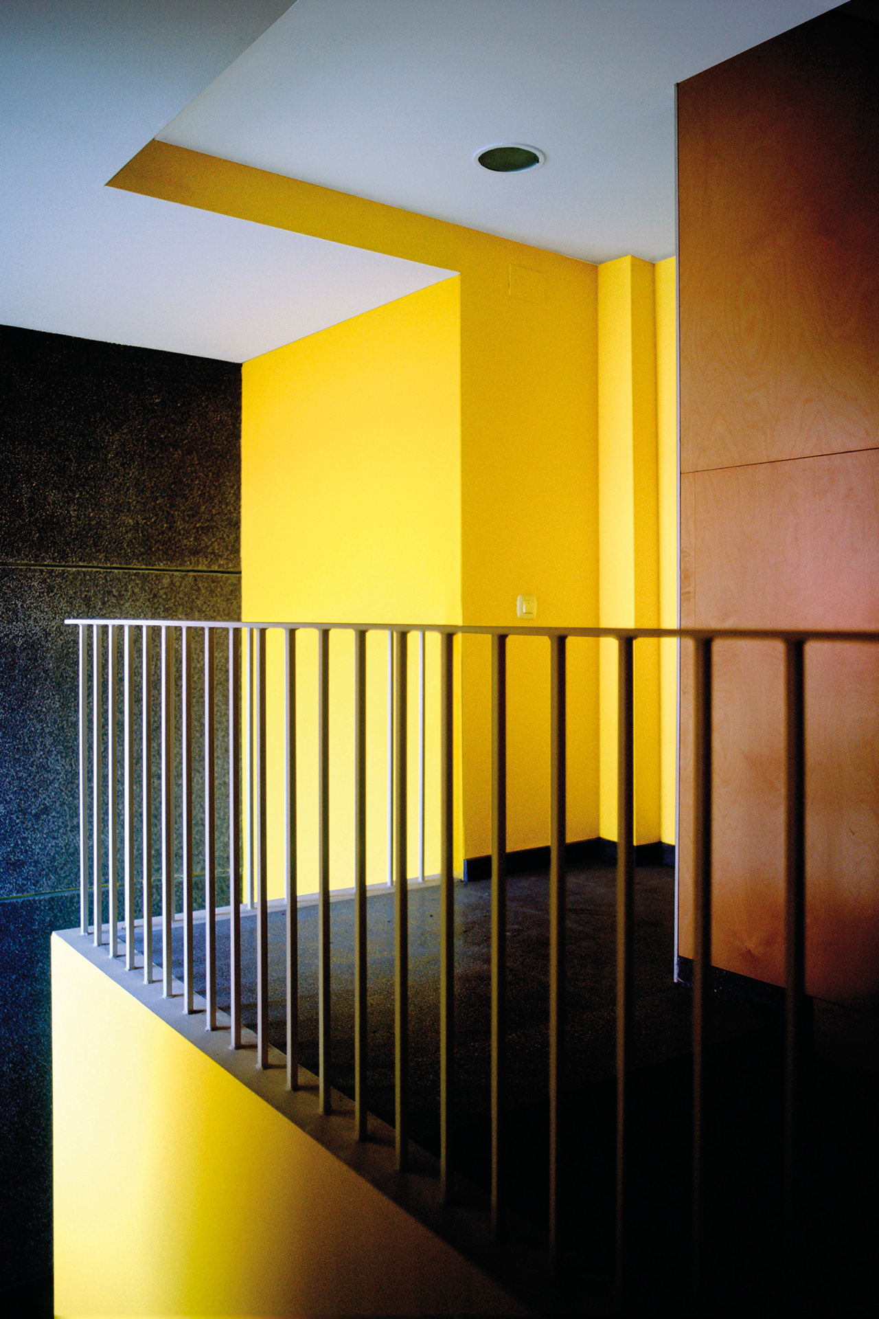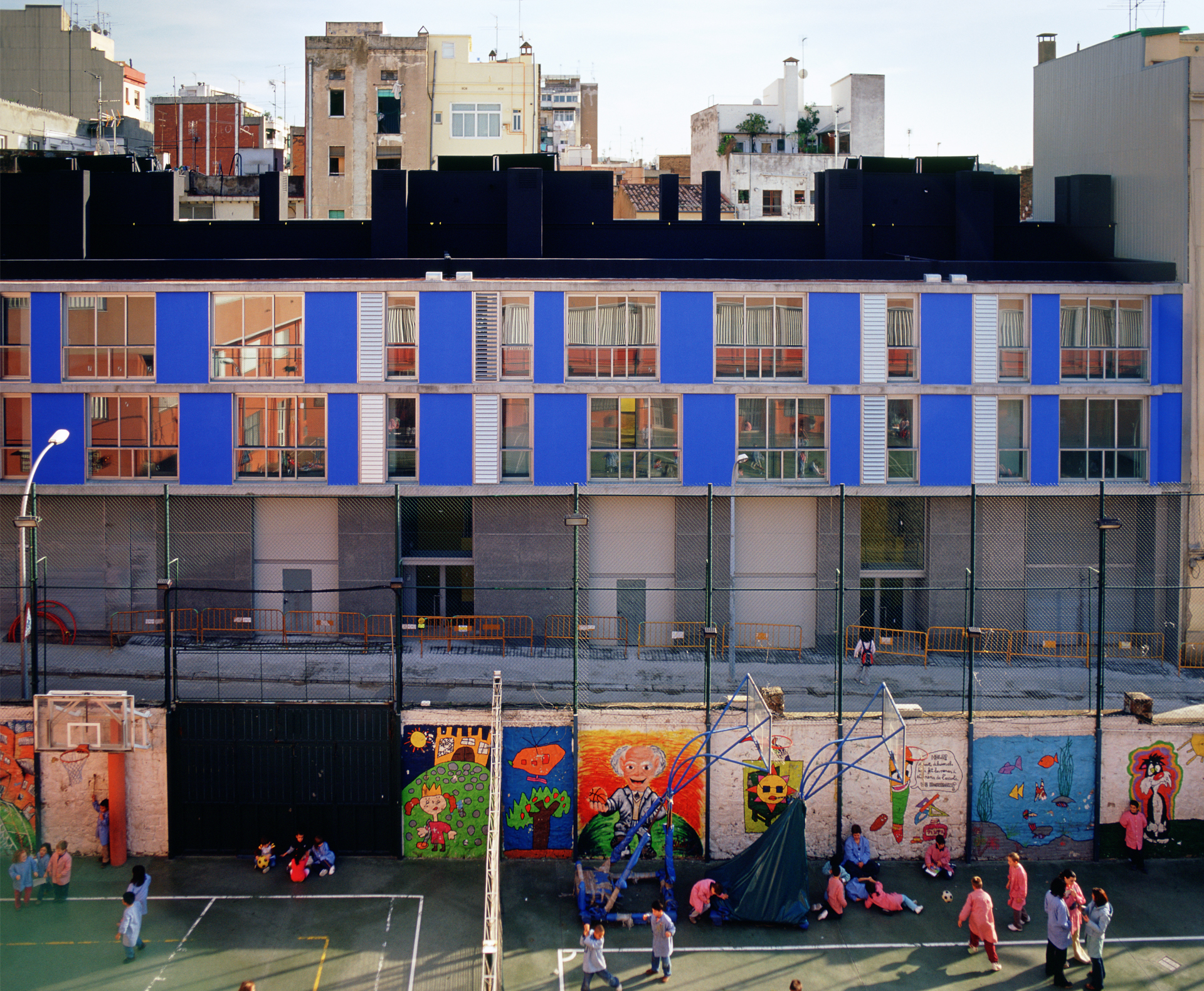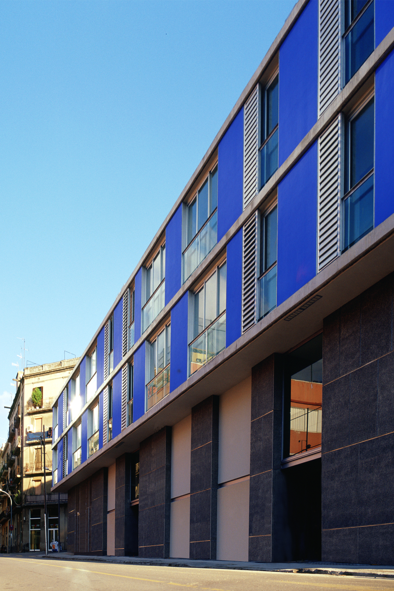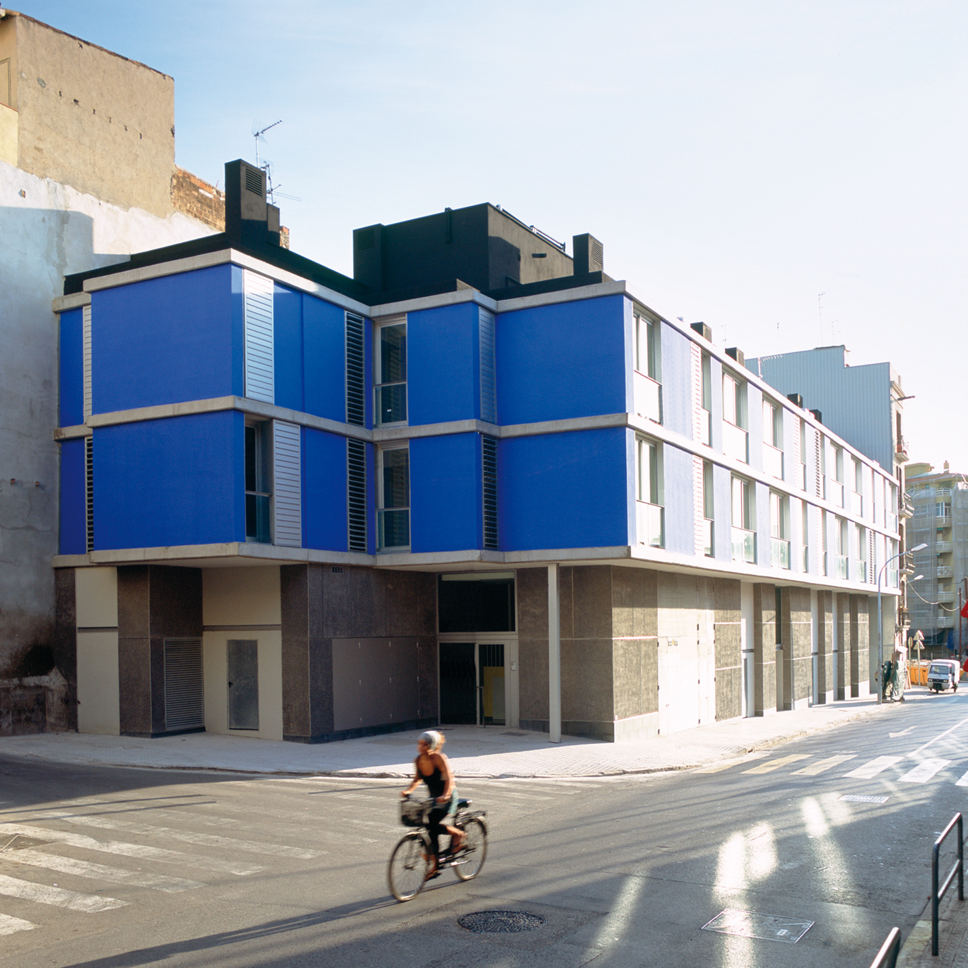 Social housing build on an elongated site in the district of Sants-Montjüic in Barcelona, in a rather rundown urban setting that is undergoing regeneration. Opposite the Building is a school playground of an intense earthy colour. One end of the site tapers off into Barcelona’s typical bevelled corner, but in this case in a reduced, almost ridiculous version of the Eixample corner.