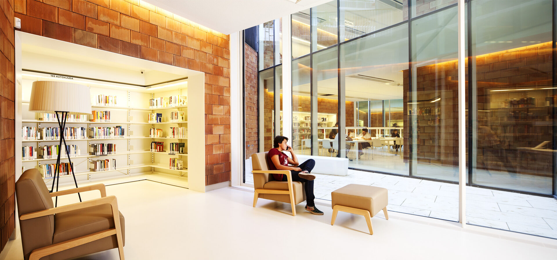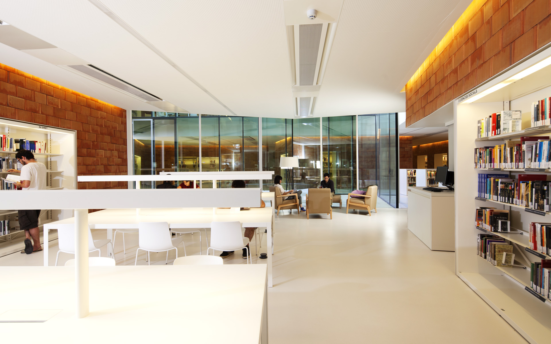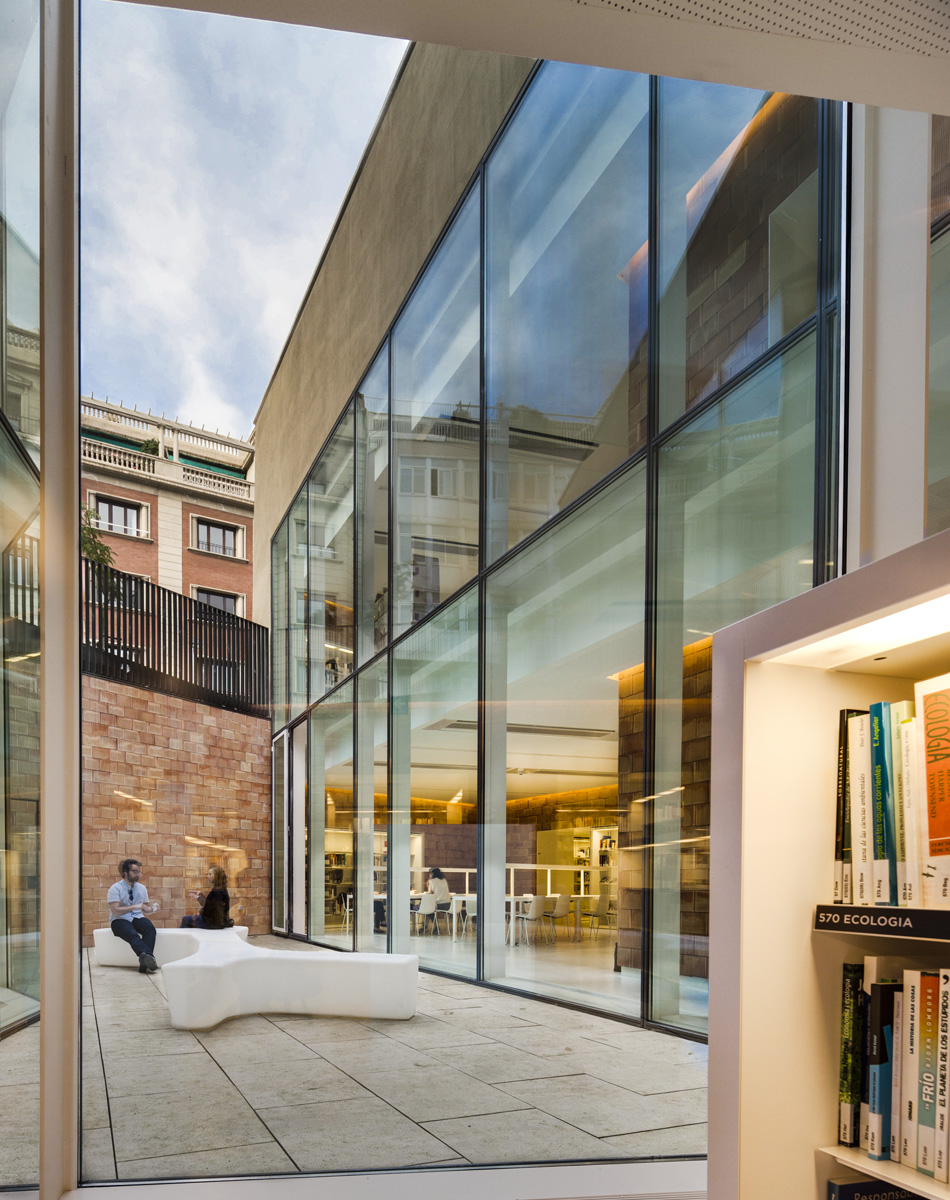 The building is shaped by the ‘light and silence patios’ and the ‘books and knowledge patios’. The first, surrounded by glass, light and ventilate the interior while isolating the library from the street. The second ones, concrete volumes filled with books, are part of the supporting structure of the library.