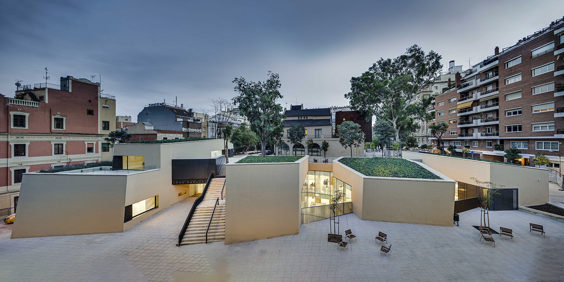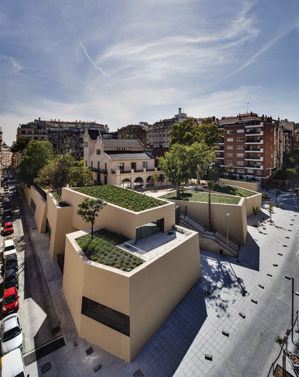 The building is particularly related to the street Sant Gervasi de Cassoles, one of the oldest and most important streets of the old core of Sant Gervasi. The unevenness between the garden and the street Sant Gervasi allows access to the new facilities naturally. On the other hand, the gardened roof is at the same level as the old garden, so that the construction of the new facility means the restoration of the garden of the civic center at its maximum dimension, where Vil·la Florida will always be the building dominating the complex.