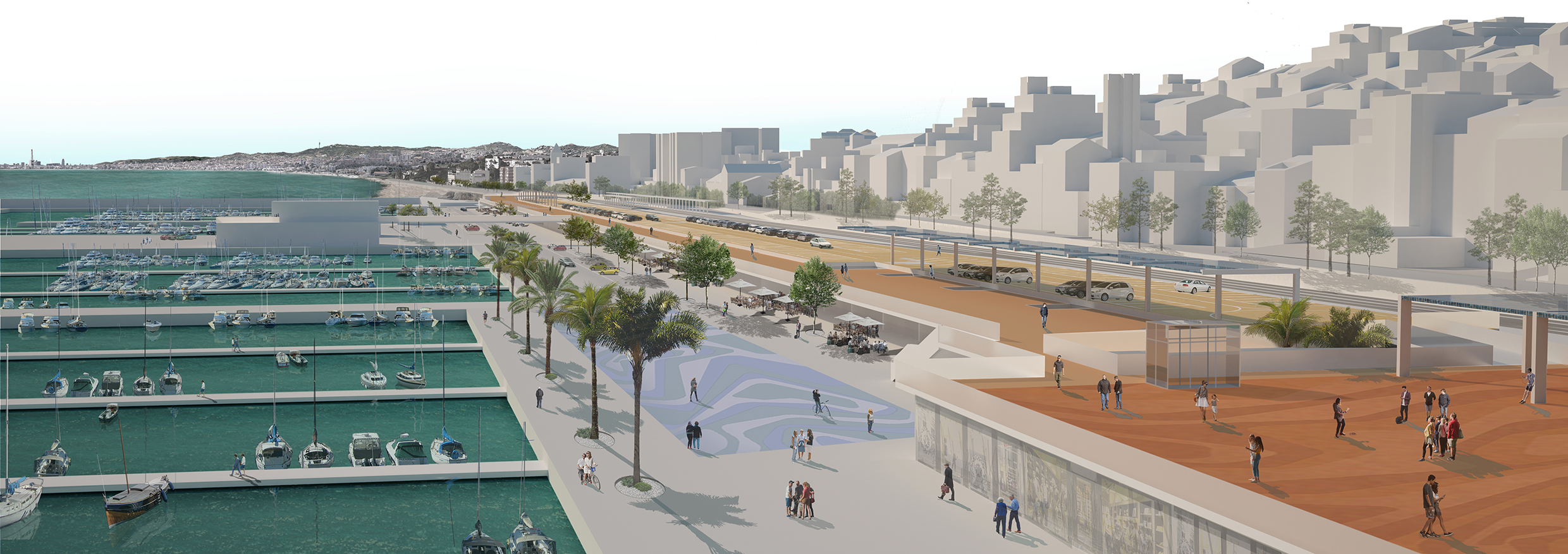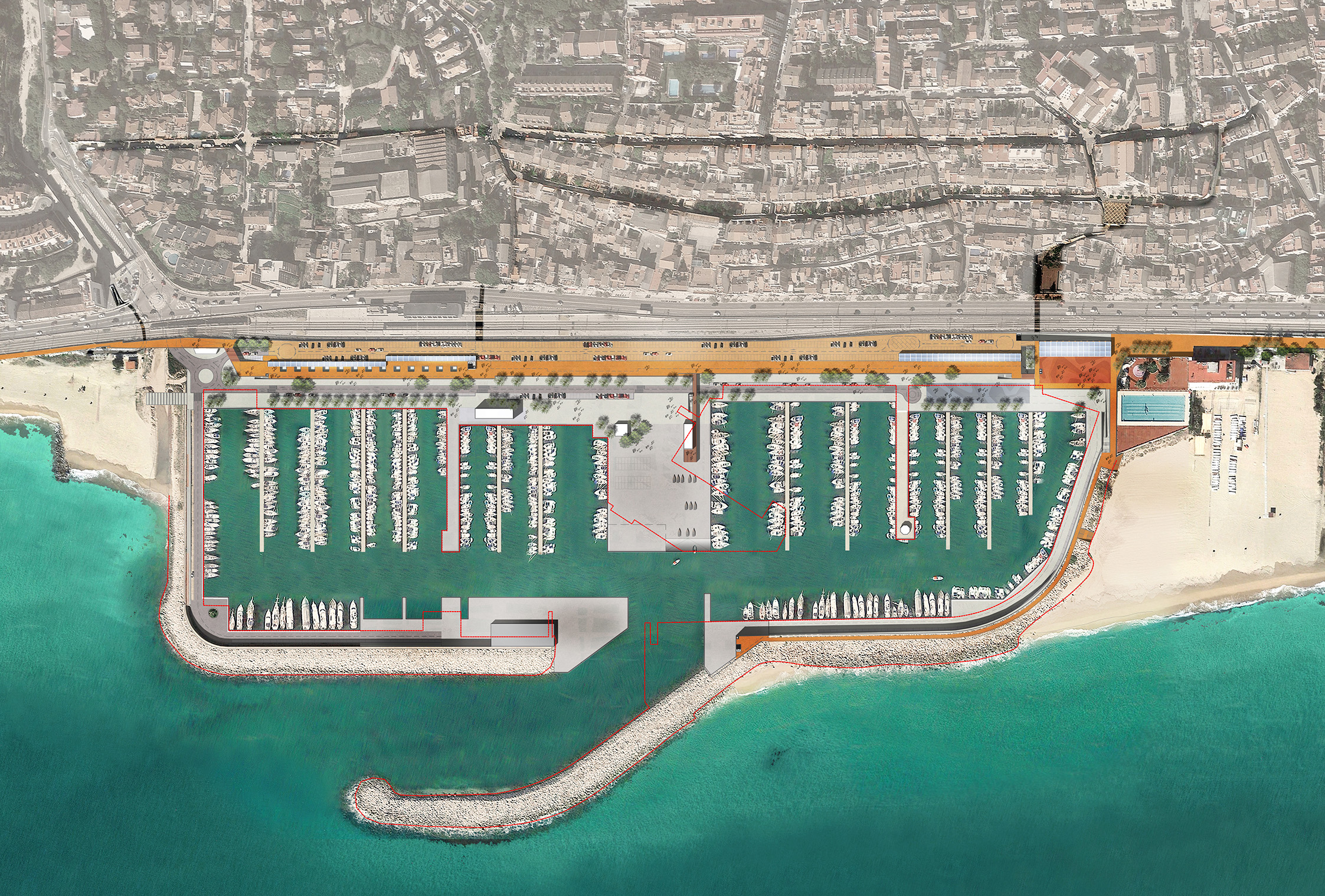 It is proposed to open the Marina to the beach by means of an overpass to walk across the Riera d’Allella allowing the use of the port’s recreational and sports offer to swimmers. At the level of the Marina platform and at the level of the promenade, to establish two large spaces free of buildings where various activities can be organized.