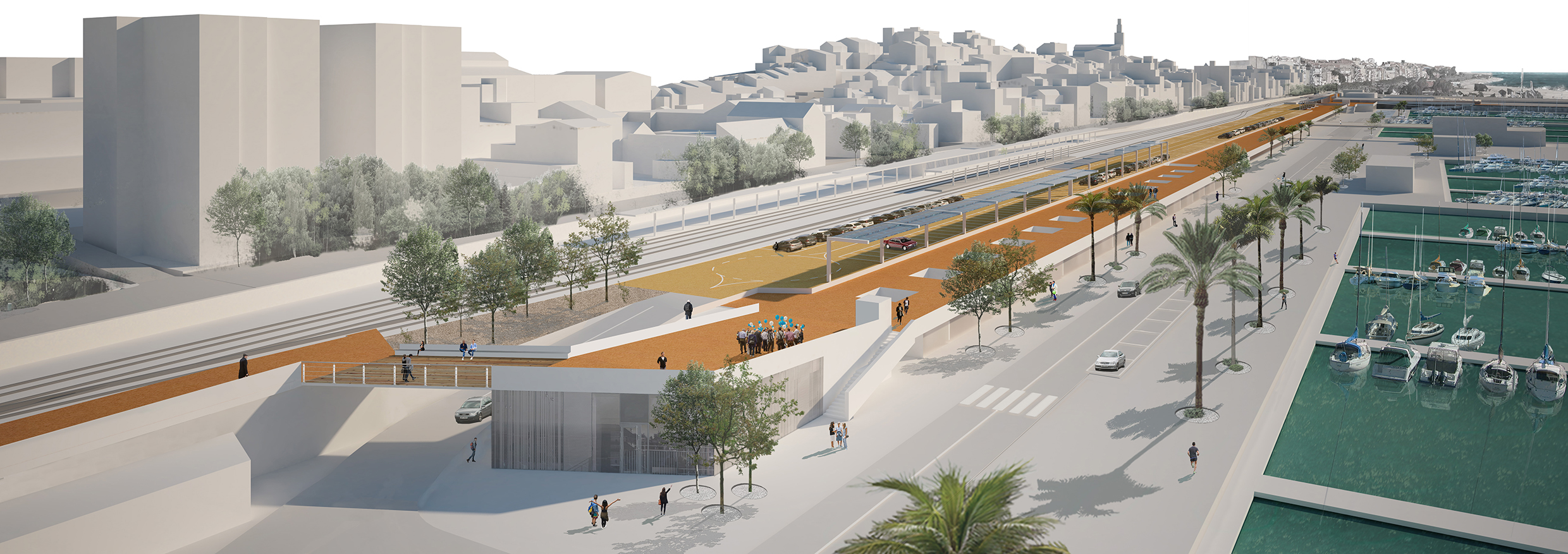 At present, the Promenade is interrupted at the height of the Marina. This Promenade divides into one path next to the railroad track fence and a second path at the end of the car park. In order to establish a clear continuity of the Promenade of El Masnou, a platform space is organized on the premises of the Marina, establishing a wide transit area as a continuation of the Promenade, with views over the Marina and moving the car park area to the train fence.